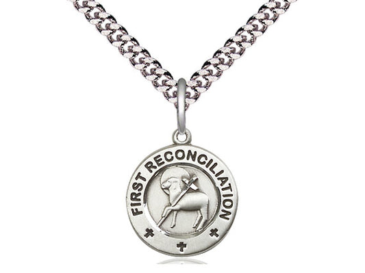 Sterling Silver First Reconciliation / Penance Pendant on a 24 inch Light Rhodium Heavy Curb Chain