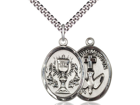 Two Sided Sterling Silver Chalice / Confirmation Medal Pendant on a 24 inch Light Rhodium Heavy Curb Chain