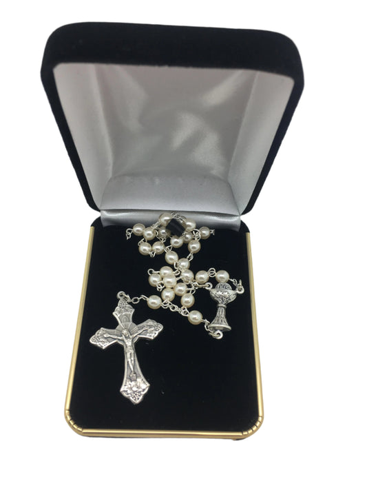 White Pearl Communion Rosary in clear Cross Case (4MM)