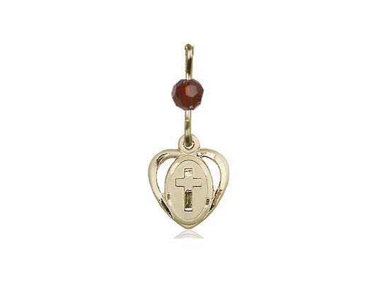 14kt Gold Filled Heart Cross Pendant with a Garnet bead on a inch Gold Filled Light Curb Chain