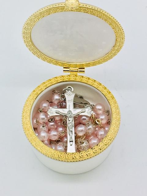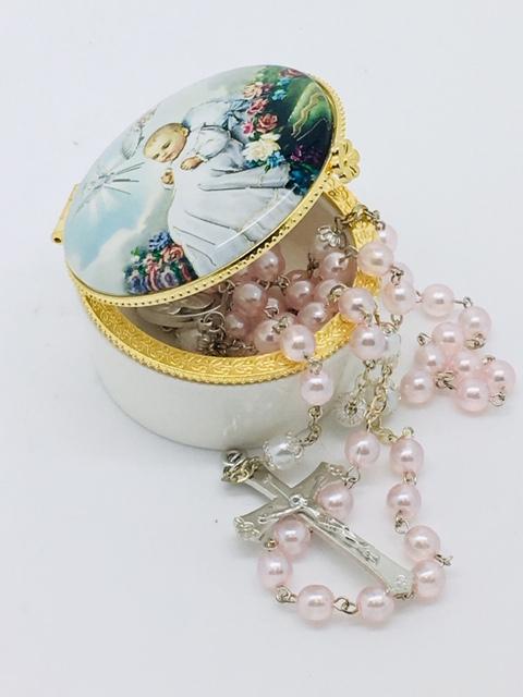 Round Porcelain Rosary First Communion Box with Glass Enclosed Top