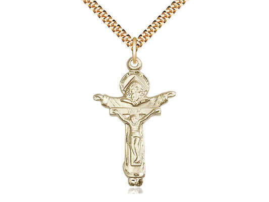 14kt Gold Filled Trinity Crucifix Pendant on a 24 inch Gold Plate Heavy Curb Chain