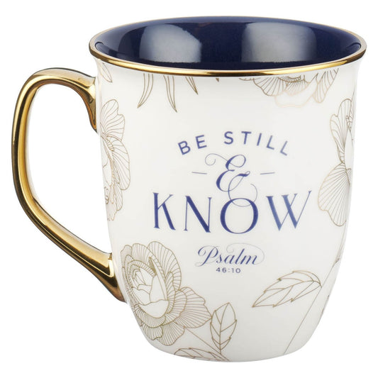Be Still and Know Blue and Gold Floral Ceramic Mug - Psalm 46:10