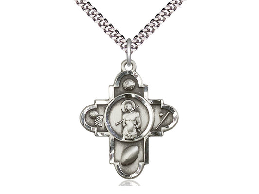 Sterling Silver Sports 5-Way St Sebastian Pendant on a 24 inch Light Rhodium Heavy Curb Chain