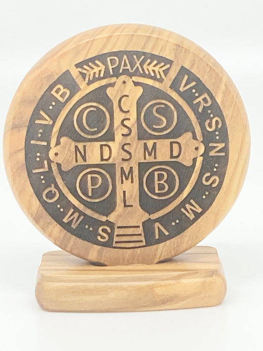 Carved Olive Wood St. Benedict Medal on Base 2 1/2"