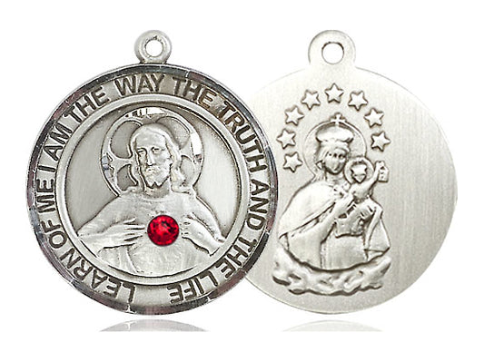 Sterling Silver Scapular Pendant with a 3mm Ruby Swarovski stone on a 24 inch Light Rhodium Heavy Curb Chain