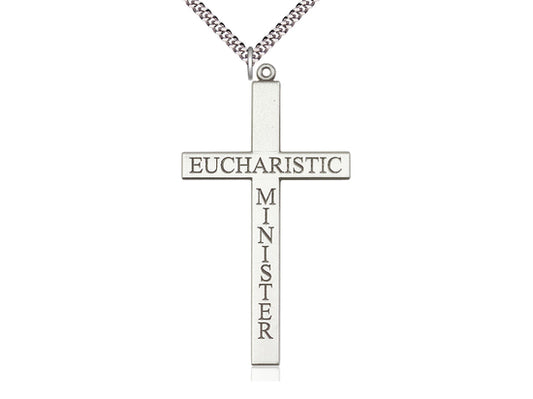 Sterling Silver Eucharistic Minister Cross Pendant on a 24 inch Light Rhodium Heavy Curb Chain