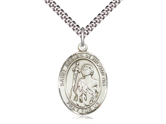 Sterling Silver St Adrian of Nicomedia Pendant on a 24 inch Light Rhodium Heavy Curb Chain.
