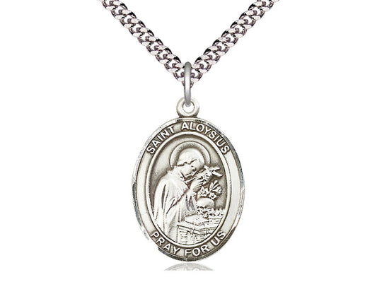 Sterling Silver St Aloysius Gonzaga Pendant on a 24 inch Light Rhodium Heavy Curb Chain.