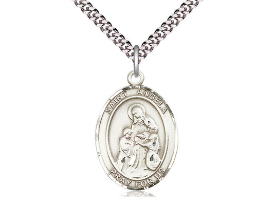 Sterling Silver St Angela Merici Pendant on a 24 inch Light Rhodium Heavy Curb Chain.