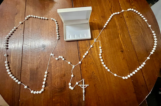 White 12MM Faux Pearl and Silver-tone Wedding Lasso Rosary