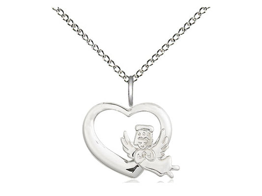 Sterling Silver Heart Guardian Angel Pendant on a 18 inch Sterling Silver Light Curb Chain
