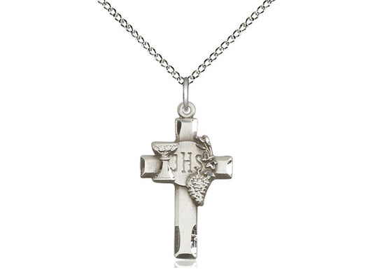 Sterling Silver Cross w/IHS Grapes Pendant on a 18 inch Sterling Silver Light Curb Chain