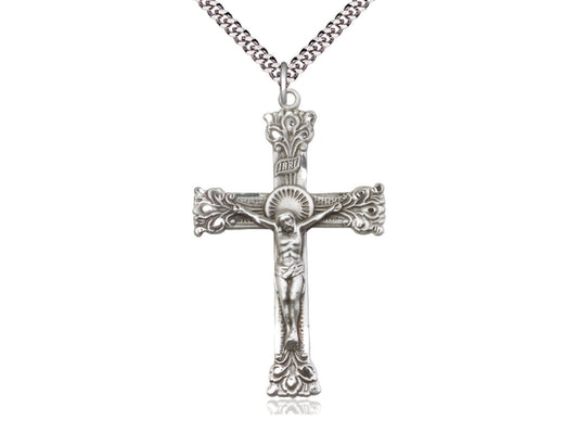Sterling Silver Crucifix Pendant on a 24 inch Light Rhodium Heavy Curb Chain