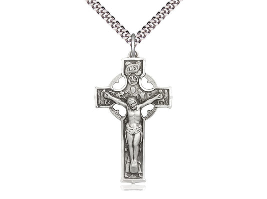 Sterling Silver Celtic Crucifix Pendant on a 24 inch Light Rhodium Heavy Curb Chain