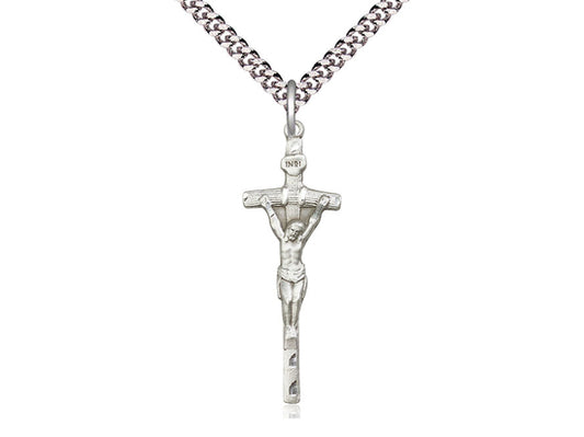 Sterling Silver Papal Crucifix Pendant on a 24 inch Light Rhodium Heavy Curb Chain