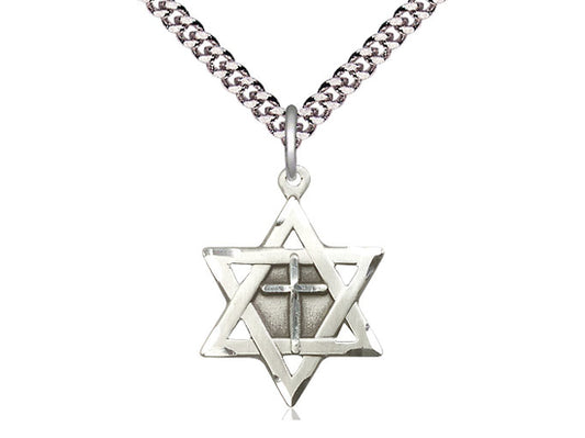 Sterling Silver Star of David w/ Cross Pendant on a 24 inch Light Rhodium Heavy Curb Chain