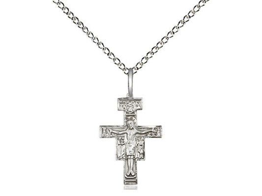 Sterling Silver San Damiano Crucifix Pendant on a 18 inch Sterling Silver Light Curb Chain