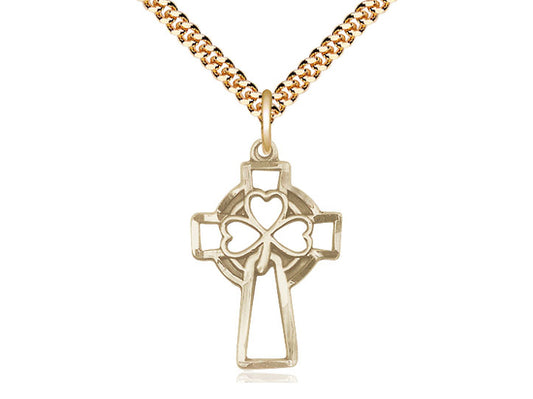 14kt Gold Filled Shamrock Cross Pendant on a 24 inch Gold Plate Heavy Curb Chain