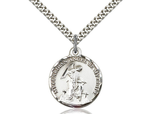 Sterling Silver Guardian Angel Pendant on a 24 inch Light Rhodium Heavy Curb Chain
