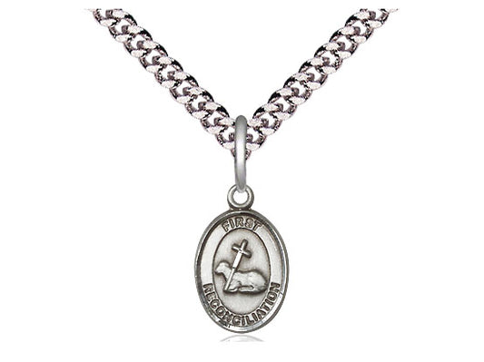 Sterling Silver First Reconciliation / Penance Pendant on a 24 inch Light Rhodium Heavy Curb Chain