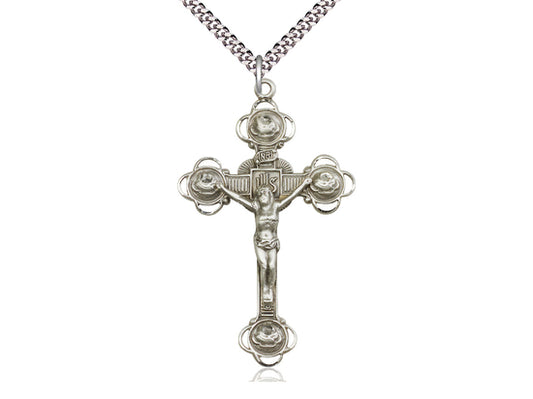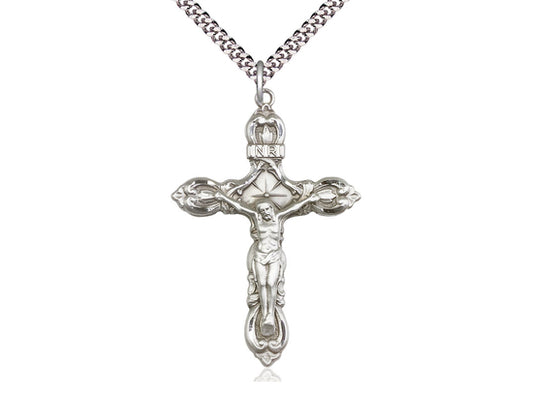 Sterling Silver Crucifix Pendant on a 24 inch Light Rhodium Heavy Curb Chain.