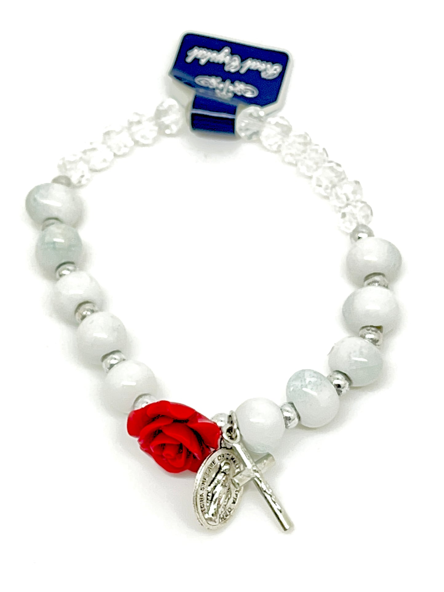 This stunning Rosary Bracelet features a Red Rose Shaped Our Father bead, accompanied by ten 6mm Crystal Beads and ten 8mm off-white Hail Mary beads. It also includes a Silver tone Miraculous Medal and Crucifix made of Real Crystal, expertly crafted in Italy. Packaged in a Deluxe black velvet box for a luxurious touch.