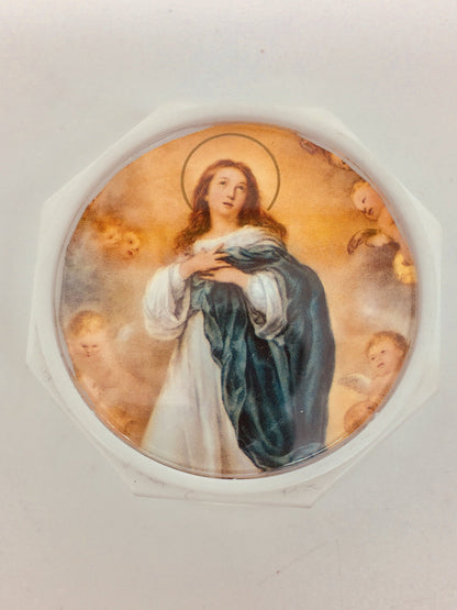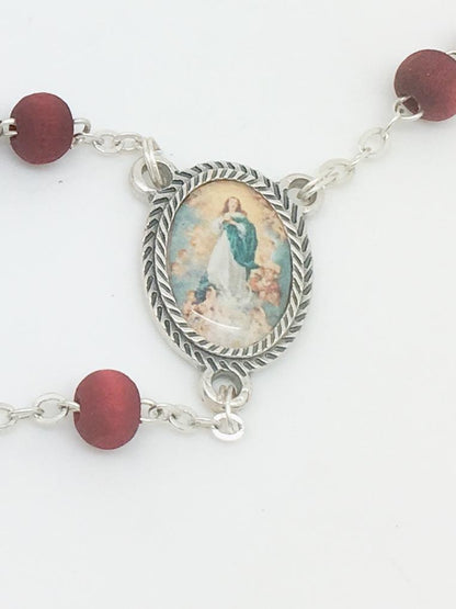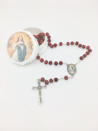 Immaculate Conception Wood Rose Scented Rosary. The image on the rosary center matches the plastic box.