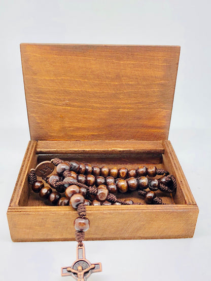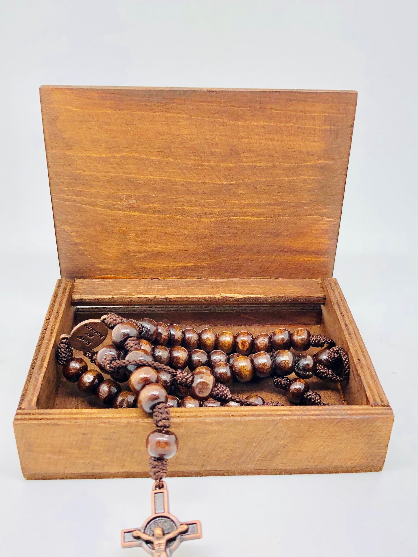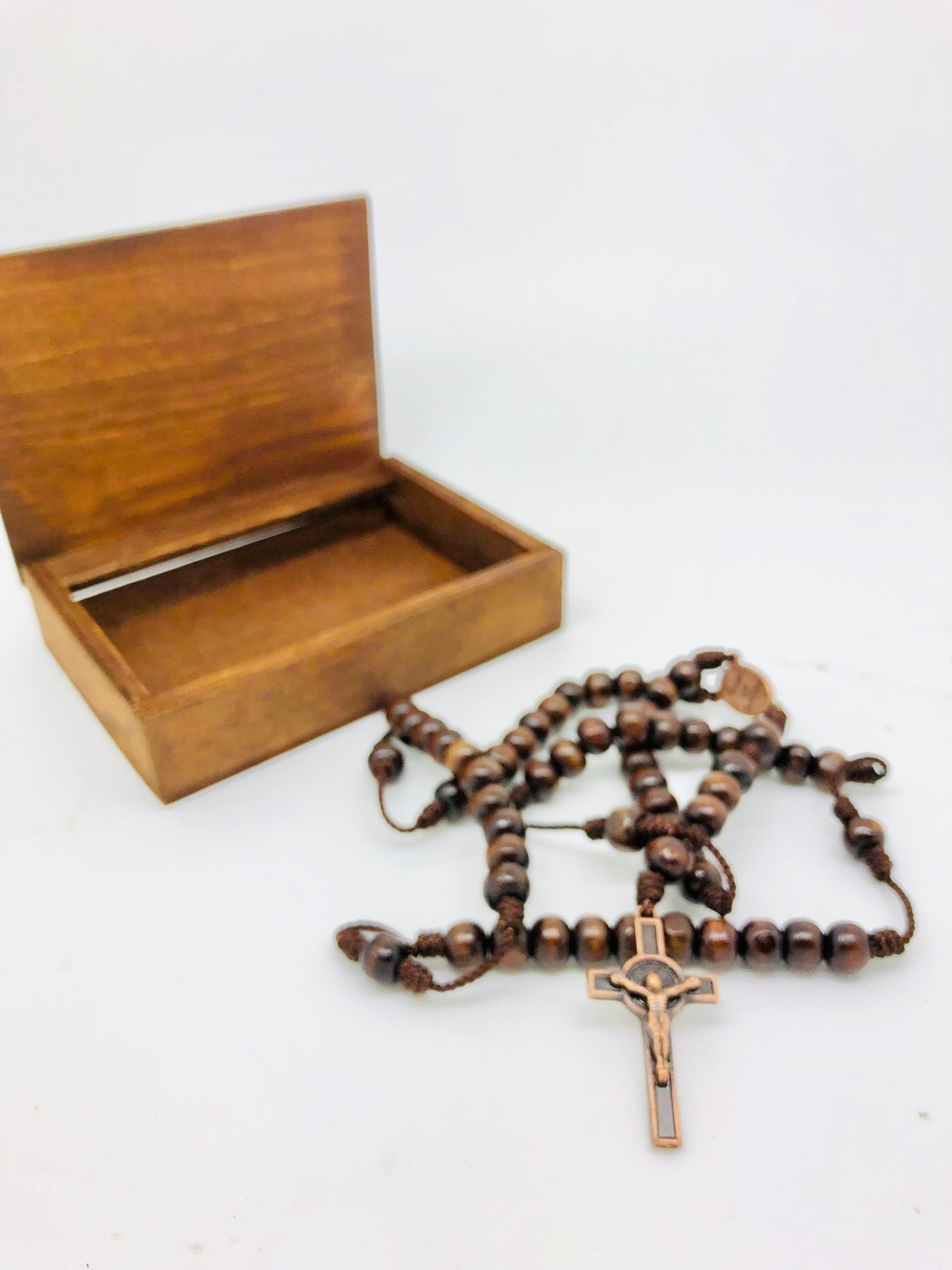 Beautiful laminated wood box with a sturdy brass and wood rosary. Wonderful gift for all occasions.