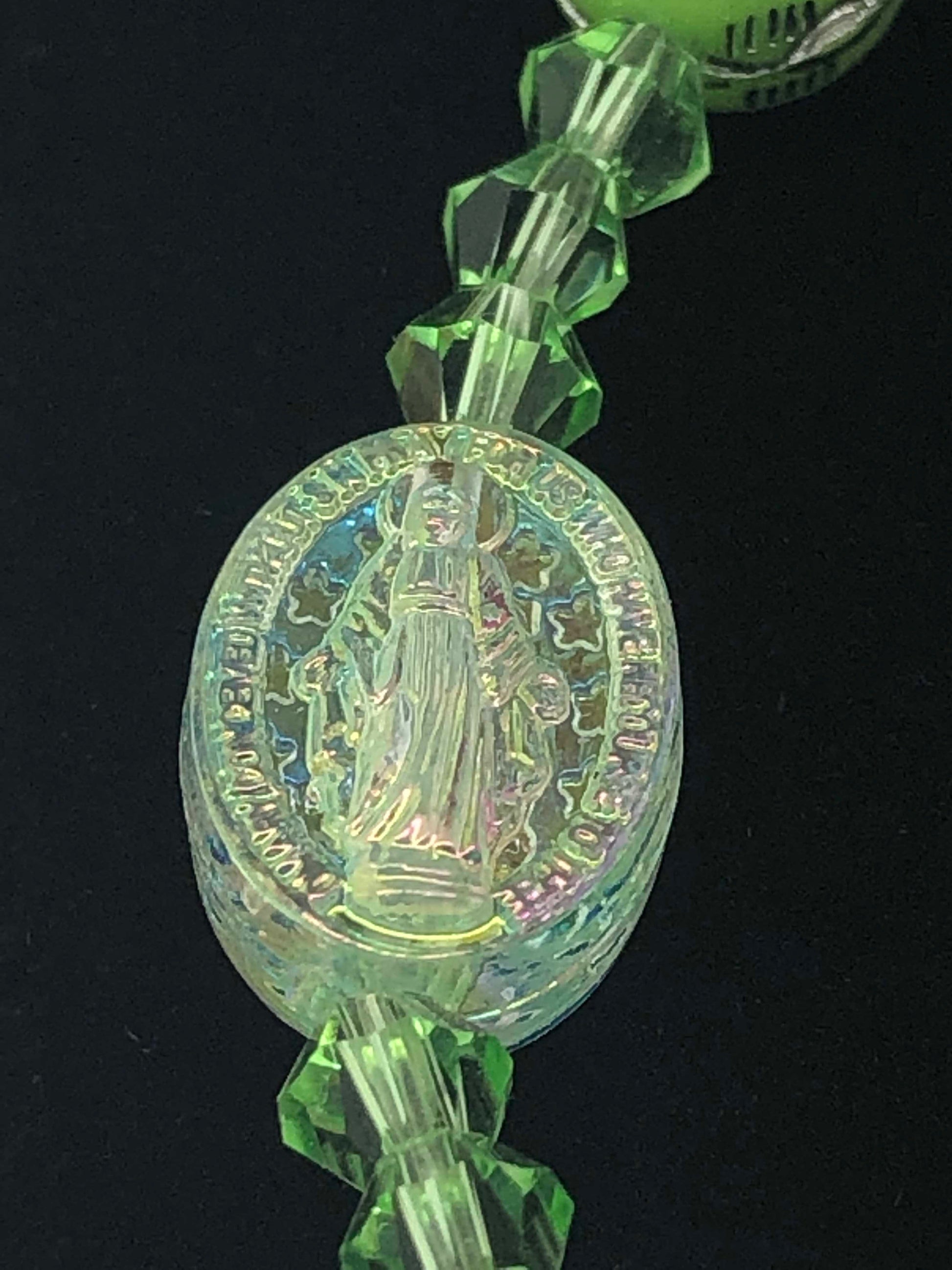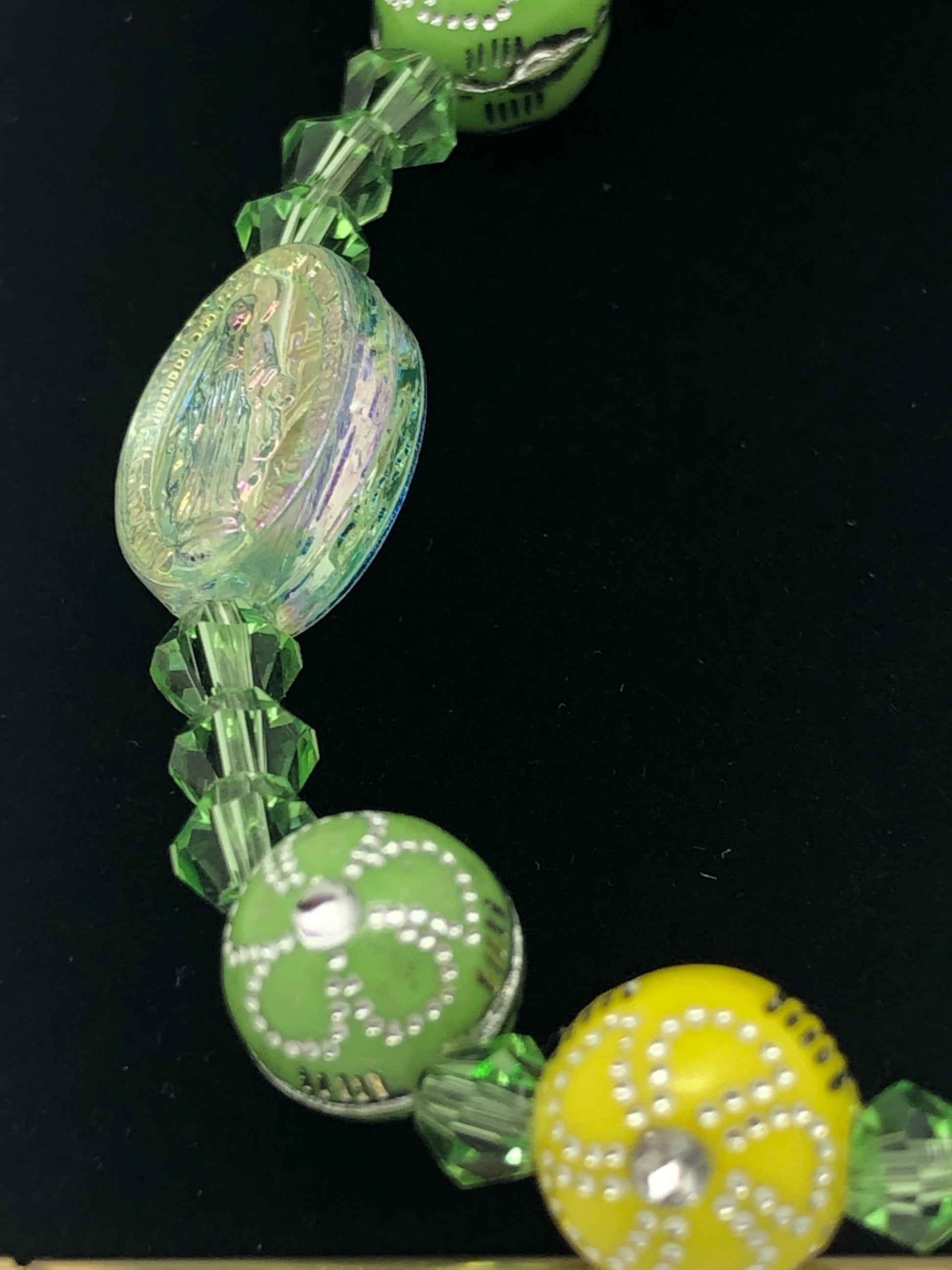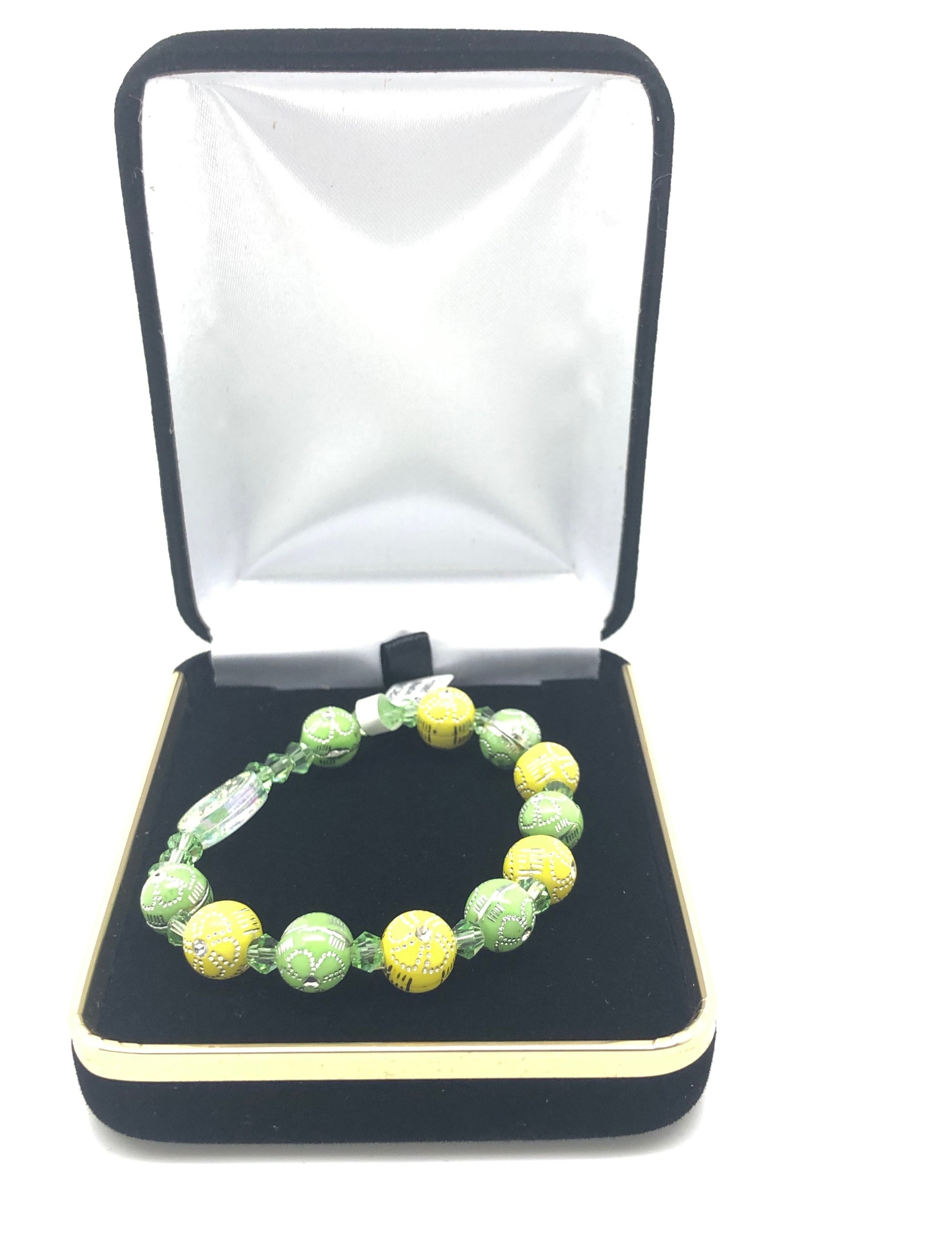 The Green Flower Acrylic Children’s Rosary Bracelet (8mm) features sturdy and durable stretch construction, with smooth and round flower designed acrylic beads. It also includes a Miraculous Medal centerpiece, and comes in a deluxe black velvet gift box with a 1.75" circumference.