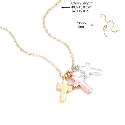 Gold, Silver and Rose Gold crosses on a gold chain.