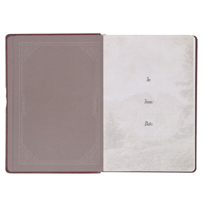 Gilt-edged pages complement the gold-foiled little, just like the brown satin ribbon marker complements the saddle tan faux leather cover. The interior pages continue the elegant design elements with brown and golden ecru lettering. At the front of the book, a presentation page decorated with a stunning mountain vista can be personalized when it is given as a gift.