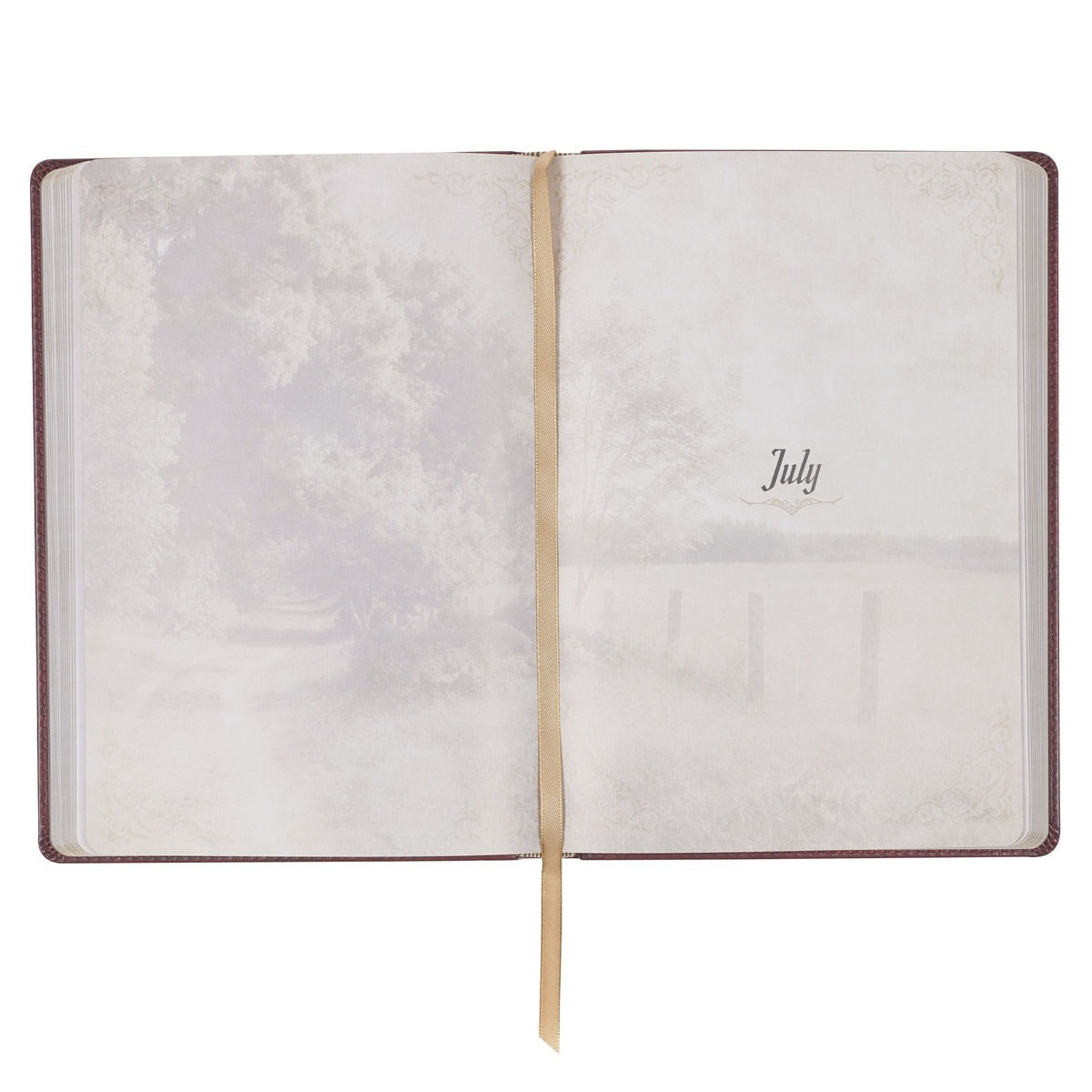 The devotional features an elegant yet simple cover design, which includes a heat-debossed frame with corner scrolls and a stylish gold-foiled title.