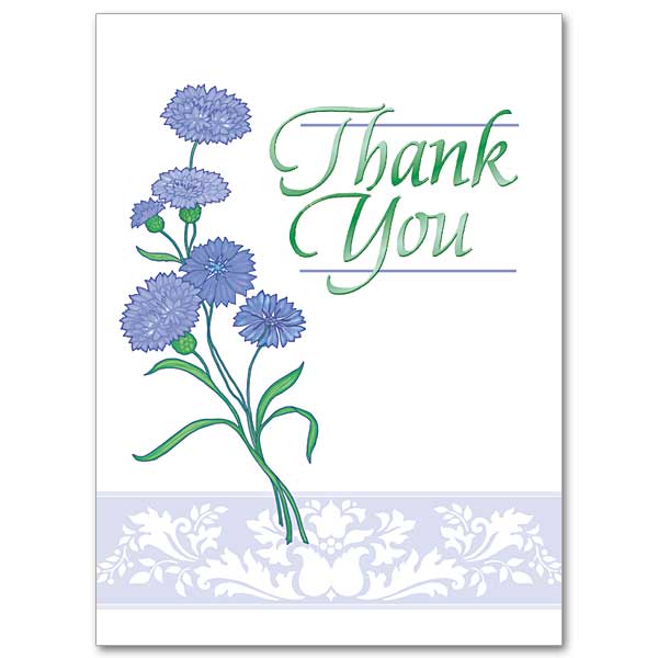 Purple Bachelor buttons at the left with lettering at the right. A panel containing a white fabric pattern on a light purple ground is at the bottom of the card.