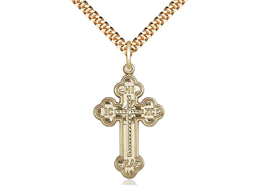 Colgante cruzado ruso lleno de oro de 14kt en una placa de oro de 24 pulgadas cadena de acera pesada