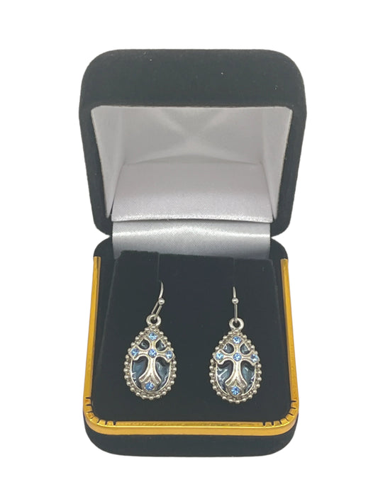 Blue Enamel and Crystal Cross Teardrop Earrings