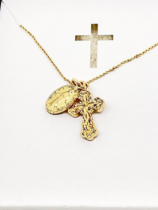 Gold Miraculous Medal and Crucifix Necklace 15" L