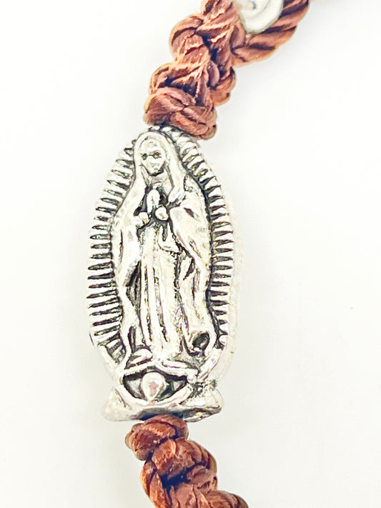 Our Lady of Guadalupe Brown Cord and Silver Sliding Bracelet