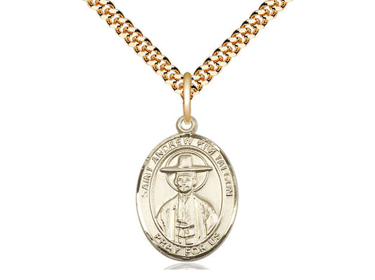 Colgante de ST Andrew Kim Taegon relleno de oro de 14kt en una cadena de acera pesada de placa de oro de 24 pulgadas.