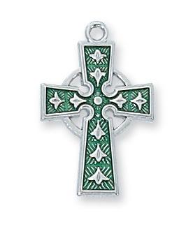 Plata de ley con crucifijo celta verde (5/8") en cadena de rodio de 18"