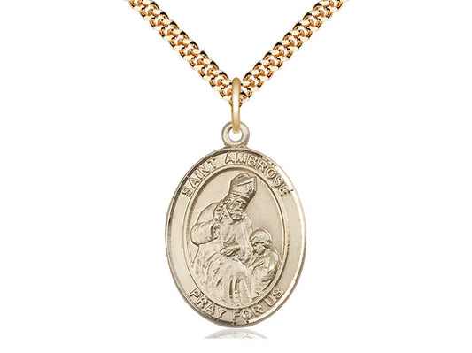 Colgante ST Ambrose relleno de oro de 14kt en una cadena de acera pesada en una placa de oro de 24 pulgadas.