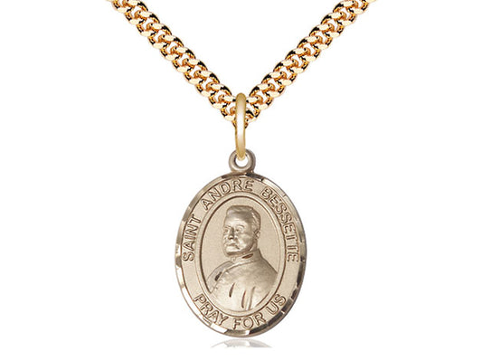 Colgante de Santa Bessette relleno de oro de 14kt en una cadena de acera pesada en una placa de oro de 24 pulgadas.