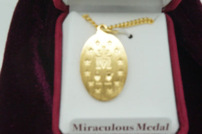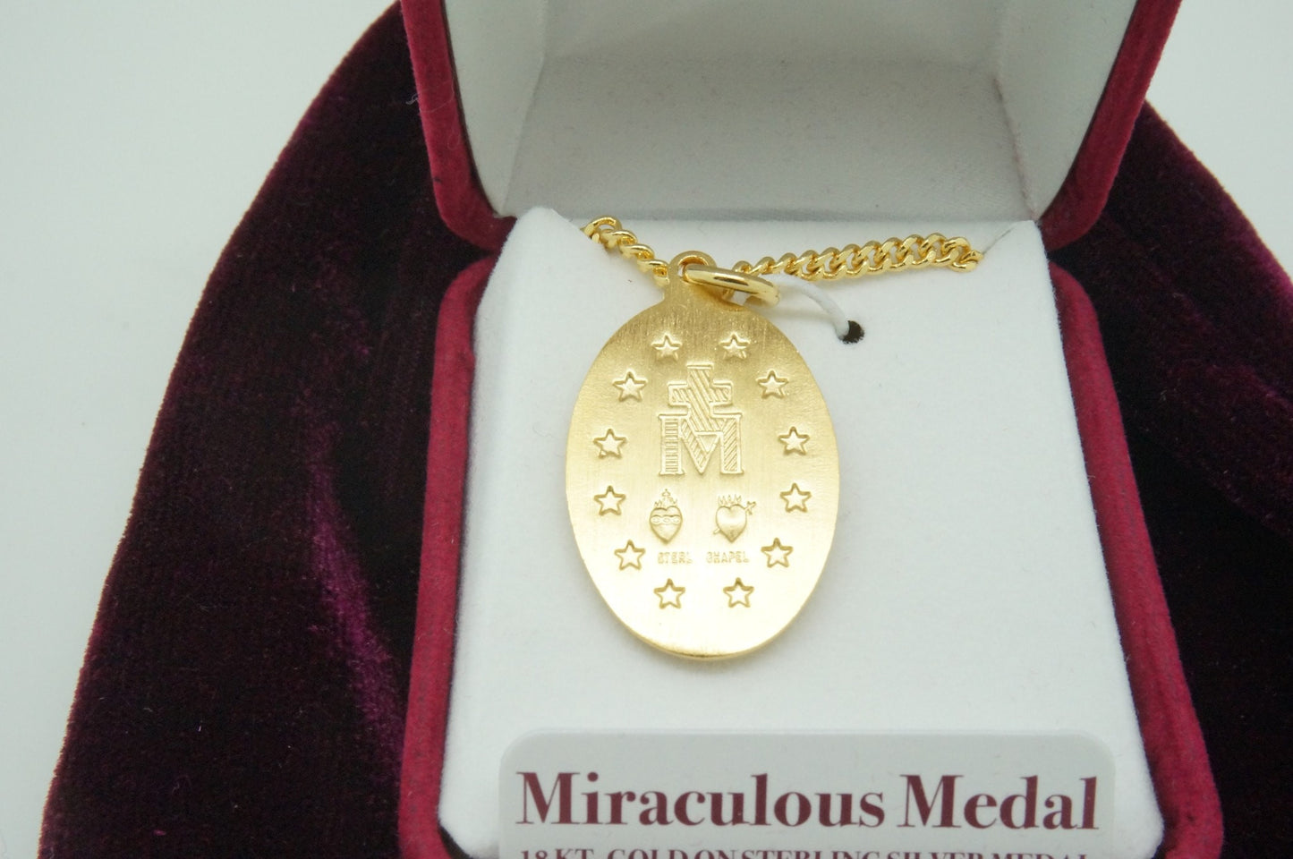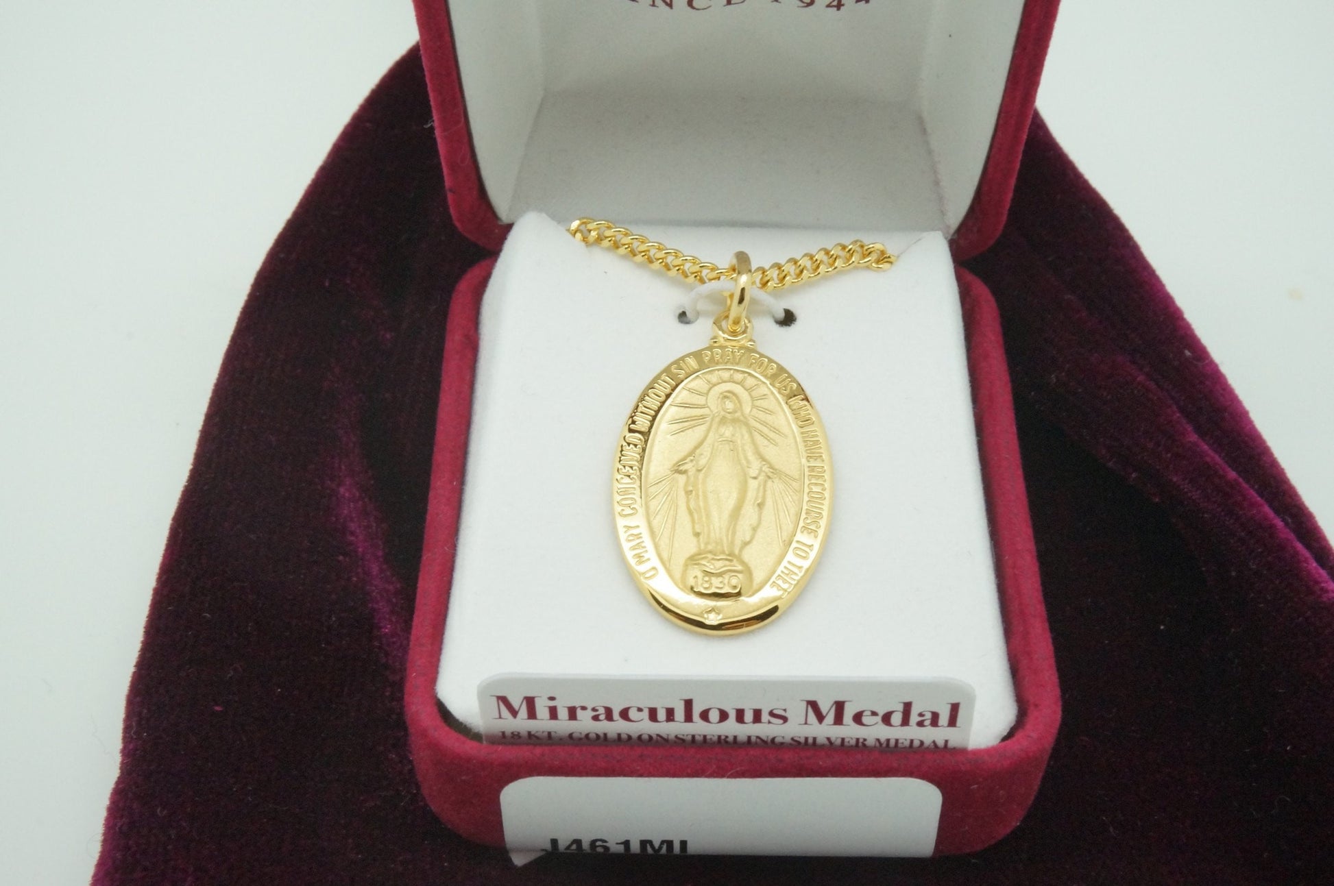 Nuestra Medalla Milagrosa de Plata de Oro de 1 "Gold Sterling con 20" cadena. Es una pieza glamorosa de joyería para cualquier ocasión especial. Viene con su caja y una bolsa de terciopelo de vino para un regalo. La medalla y la cadena tienen una garantía de por vida limitada para la calidad. Viene en la caja de un fabricante de Nueva Inglaterra, EE. UU.