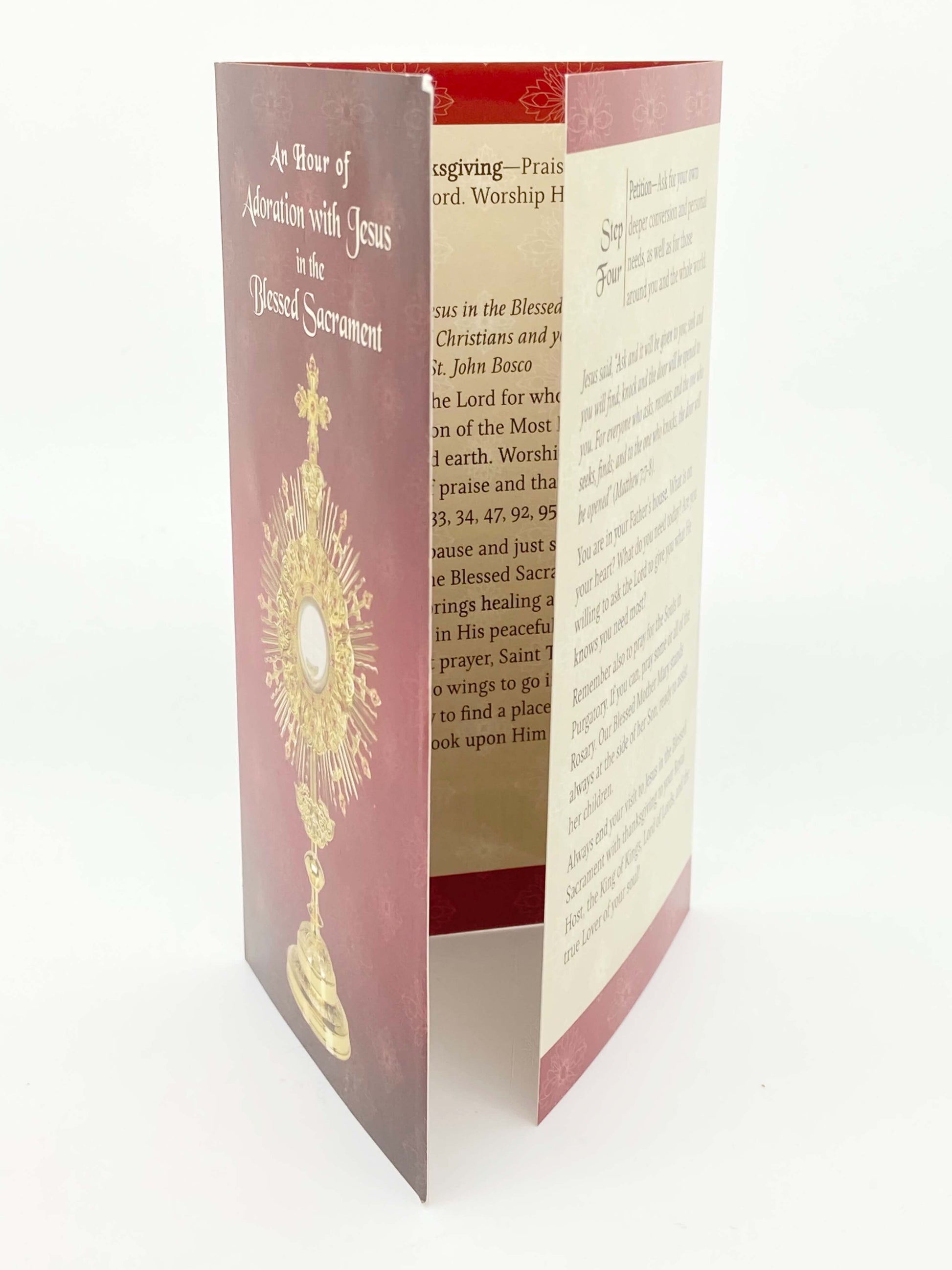 Esta guía de bolsillo de Ambrosiana ofrece cuatro sencillos pasos para hacer una buena Hora Santa: Reconocer la presencia de Dios; Acción de Gracias; Reparación; Petición.