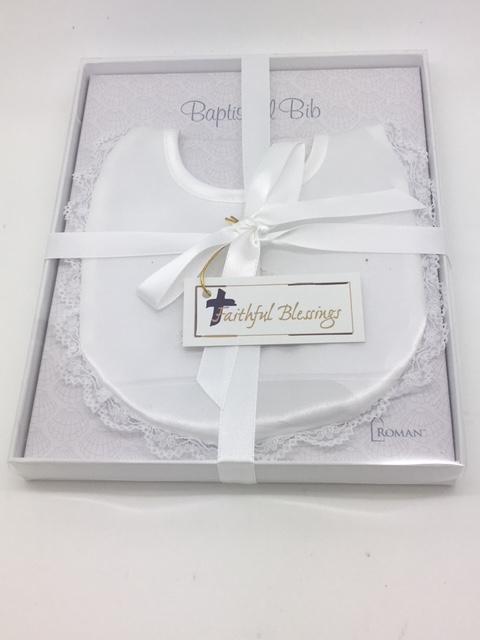 Babero bautismal de aspecto muy atractivo en relieve con una cruz y acentos también con ribete de encaje. Hará que cualquier bebé se vea increíble para ese día especial.