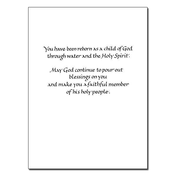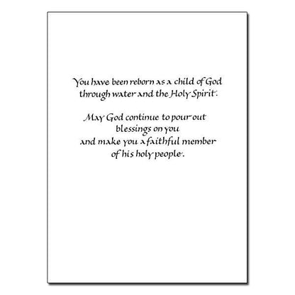 Has renacido como un hijo de Dios a través del agua y el Espíritu Santo. Que Dios continúe derramando bendiciones sobre ti y haciéndote un miembro fiel de su pueblo santo.Versículo de la Biblia: