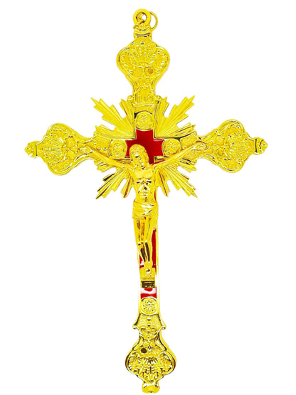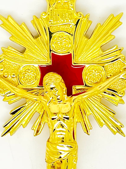 Gold Metal wall crucifix with red background to highlight the corpus. Wonderful for any home or office.