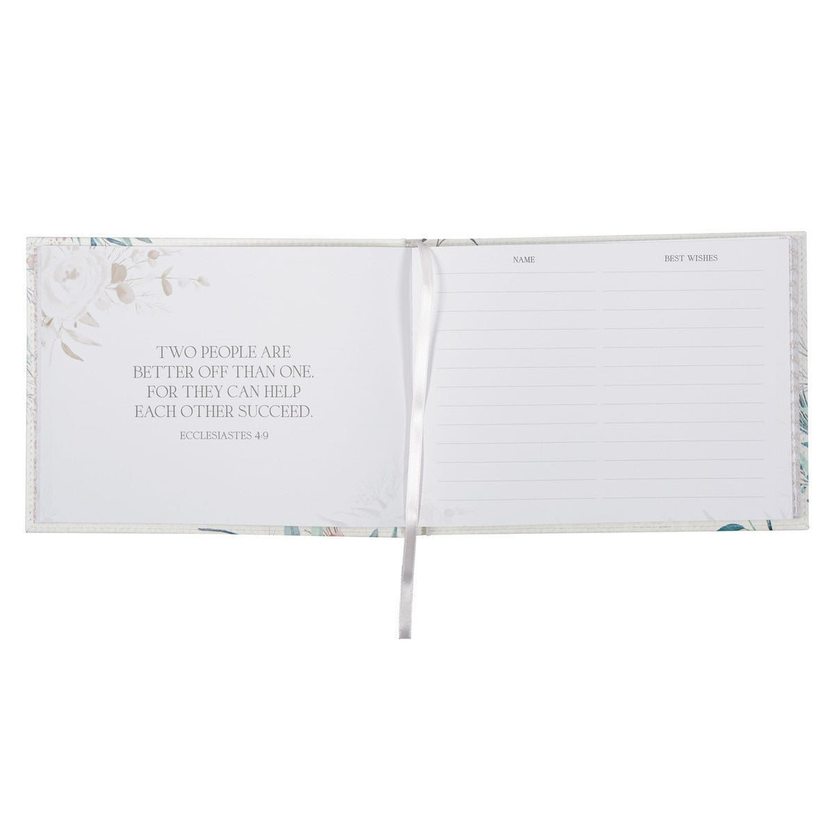 The elegantly designed Mr. & Mrs. Peachy-pink Floral Faux Leather Medium Wedding Guest Book is designed as a cherished keepsake for a couple on their auspicious wedding day. This beautiful guest book provides a unique opportunity for couples to record the names and messages of friends and family who share on their special day. The blush pink faux leather cover is adorned with two large peachy-pink floral bouquets in opposite corners. The title is screen-printed in crisp black letters. Mr. & Mrs. Guest Book The back cover echoes the floral design and features a Scripture verse in large black screen-printed letters. We love because He first loved us 1 John 4:19 Topstitching along the edges of the guest book ensures sturdy construction designed to last a lifetime. It includes a pink satin ribbon to bookmark a special page. The front page is dedicated to capturing the details of the special day, followed by a page for your love story. With 160 lined pages, there's ample space for guests to record their names and a personal message. This guest book is packaged in a full-color printed gift box with a clear acetate lid that can be used to store it after the wedding. The Mr. & Mrs. Peachy-pink Floral Faux Leather Medium Wedding Guest Book is part of the Mr. and Mrs. Peach Floral Collection, designed to celebrate engagements or weddings. This collection includes a gift pen, a conversation starter set, a thank you note card set, a guest book, and a gift bag. Include the Mr. & Mrs. Peachy-pink Floral Faux Leather Medium Wedding Guest Book as part of an engagement or wedding shower gift. This thoughtful addition will help the happy couple make their special day truly unforgettable.