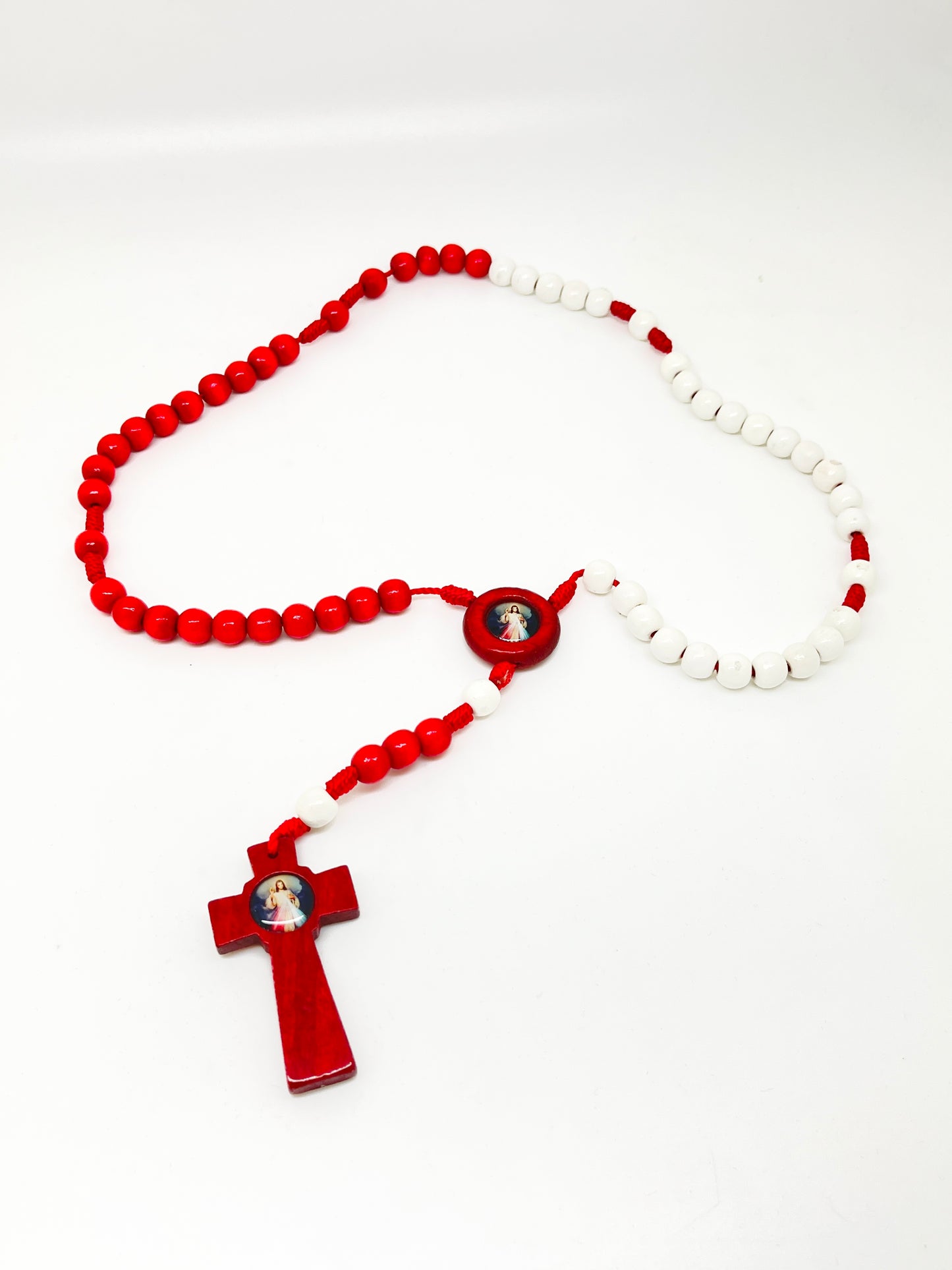 Cuentas de madera roja y blanca para el cuerpo y la sangre de Jesús. La pieza central de misericordia divina y los separadores de décadas a juego. Maravilloso rosario por la devoción de la misericordia Divina. Jesús, confío en ti.