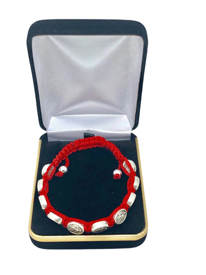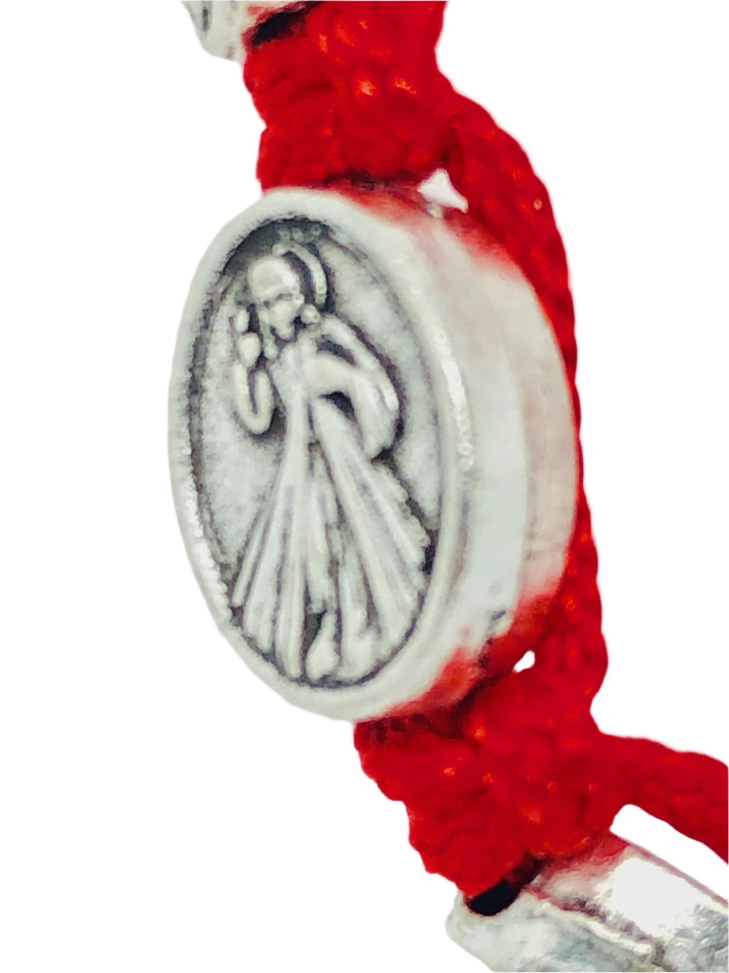 Medalla de plata de la Divina Misericordia en un cordón rojo tejido. Nudo corredizo, talla única. Lleve su rosario directamente en su muñeca. Viene en una lujosa caja de regalo de terciopelo negro.